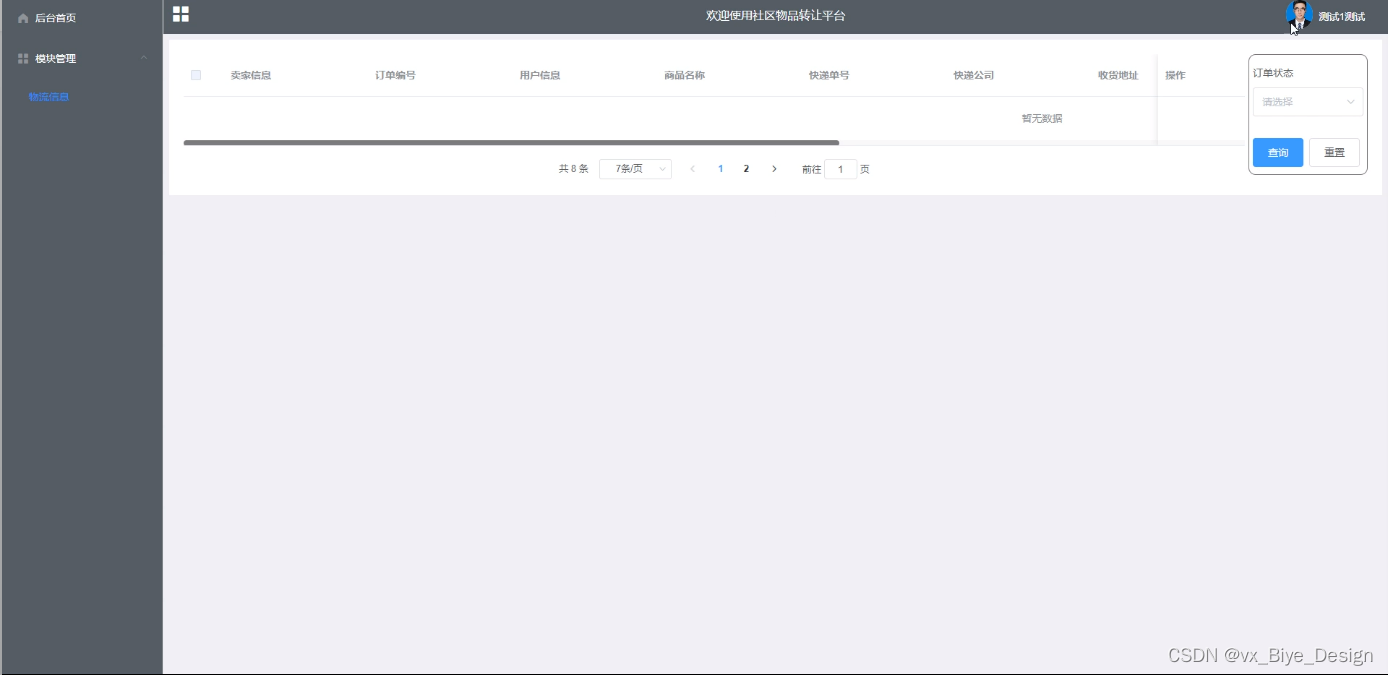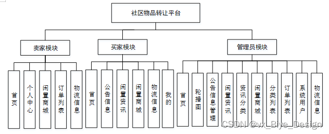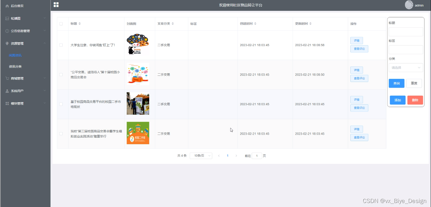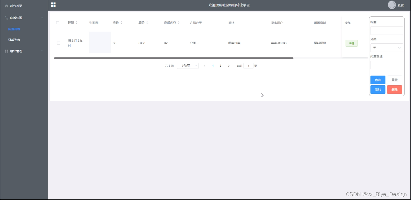The system adopts django framework, python language, MySQL database and other technologies. The main functional modules of the community goods transfer platform have been basically realized. The system has three major functional modules: administrator, buyer and seller. The administrator: home page, rotation chart (rotation chart management), announcement information management (announcement information), resource management (idle information, information classification), mall management (idle mall, classification list, order list), system user (administrator, seller, buyer) Module management (logistics information); Seller: home page, personal center, mall management (idle mall, order list), module management (logistics information); Buyer: Home page, announcement information, idle information, idle mall, logistics information, mine and other operations.