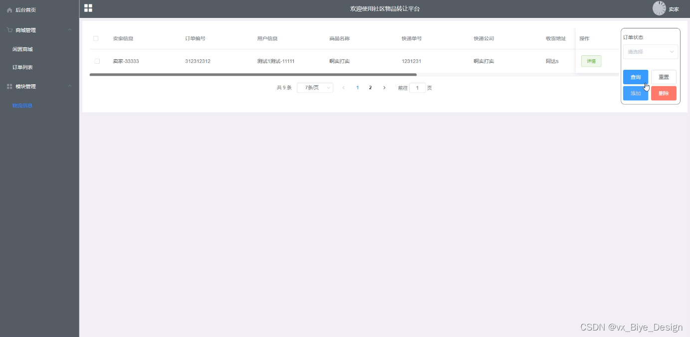 物流信息,在物流信息页面中可以查看卖家信息、订单编号、用户信息、商品名称、快递单号、快递公司、收货地址、订单状态等信息,并进行查询、添加等操作;如图5-4所示。