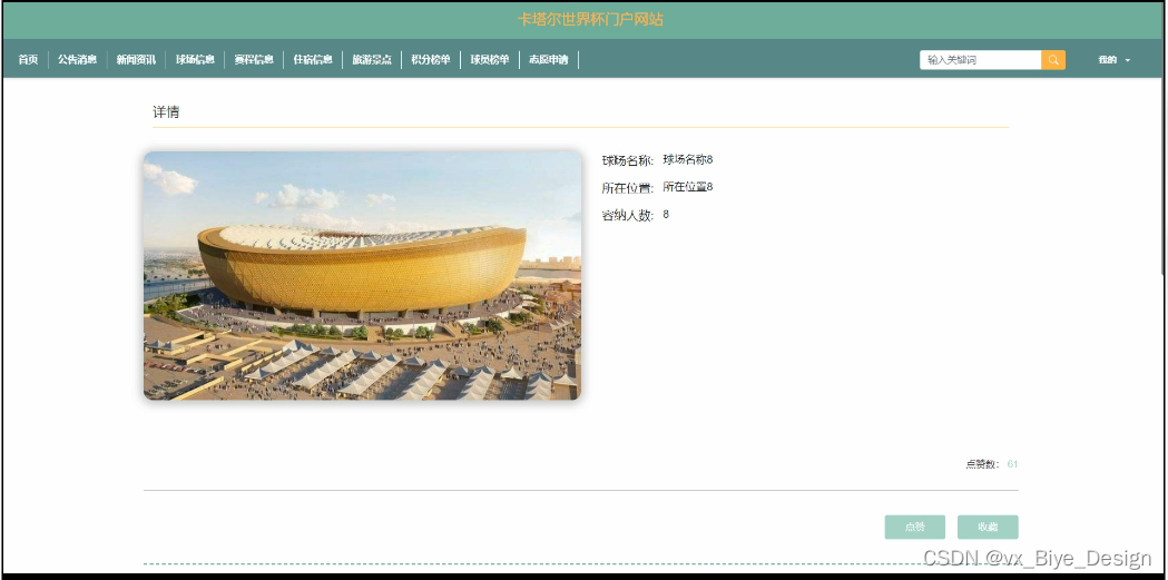 球场信息,在此页面可以查看球场详细信息,如(球场名称、所在位置、容纳人数、球场简介),并可进行收藏、点赞、评论等操作等操作,如图5-4所示。