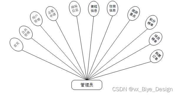 系统中的核心用户是系统管理员,管理员登录后,通过管理员菜单来管理后台系统。主要功能有:首页、公共管理(轮播图、公告栏)、用户管理(管理员、普通用户、票务用户、媒体用户)、信息管理(球场信息、赛程信息、住宿信息、旅游景点、积分榜单、球员榜单、购票订单、志愿申请);等功能。管理员端用例如图3-7所示。