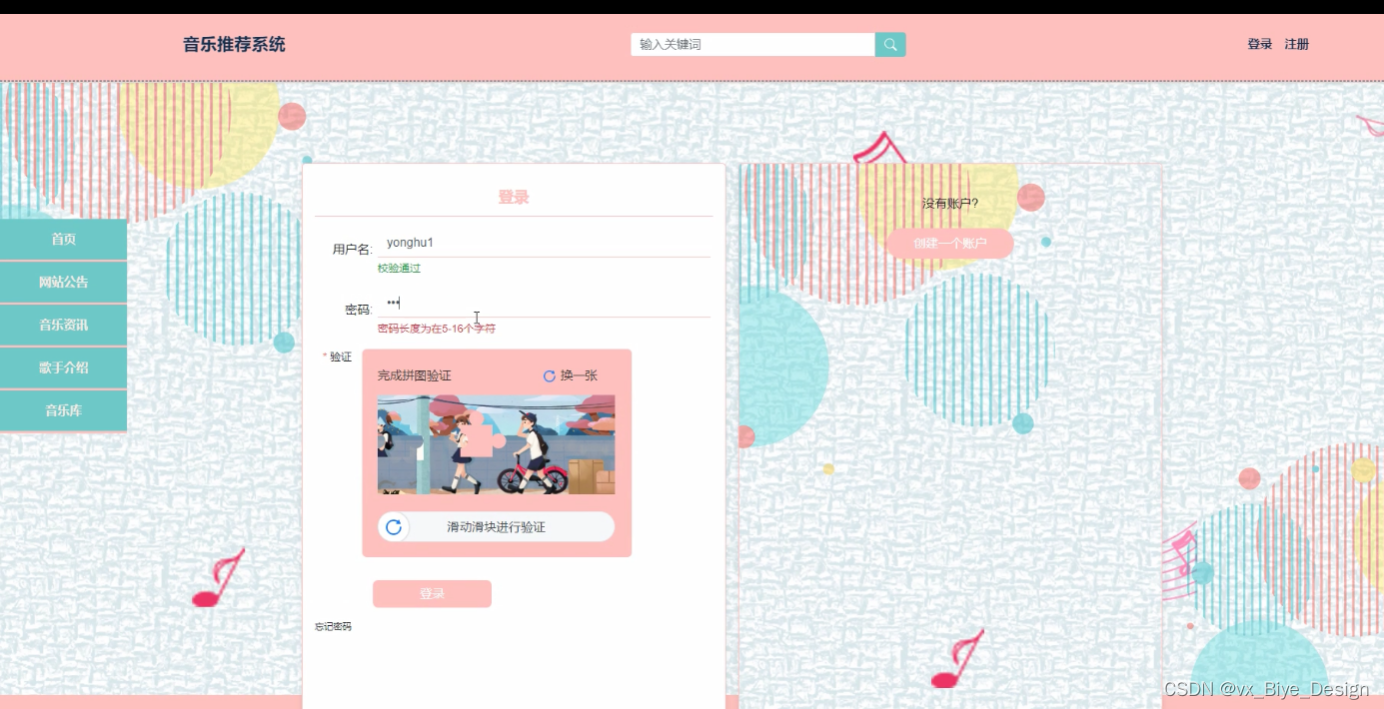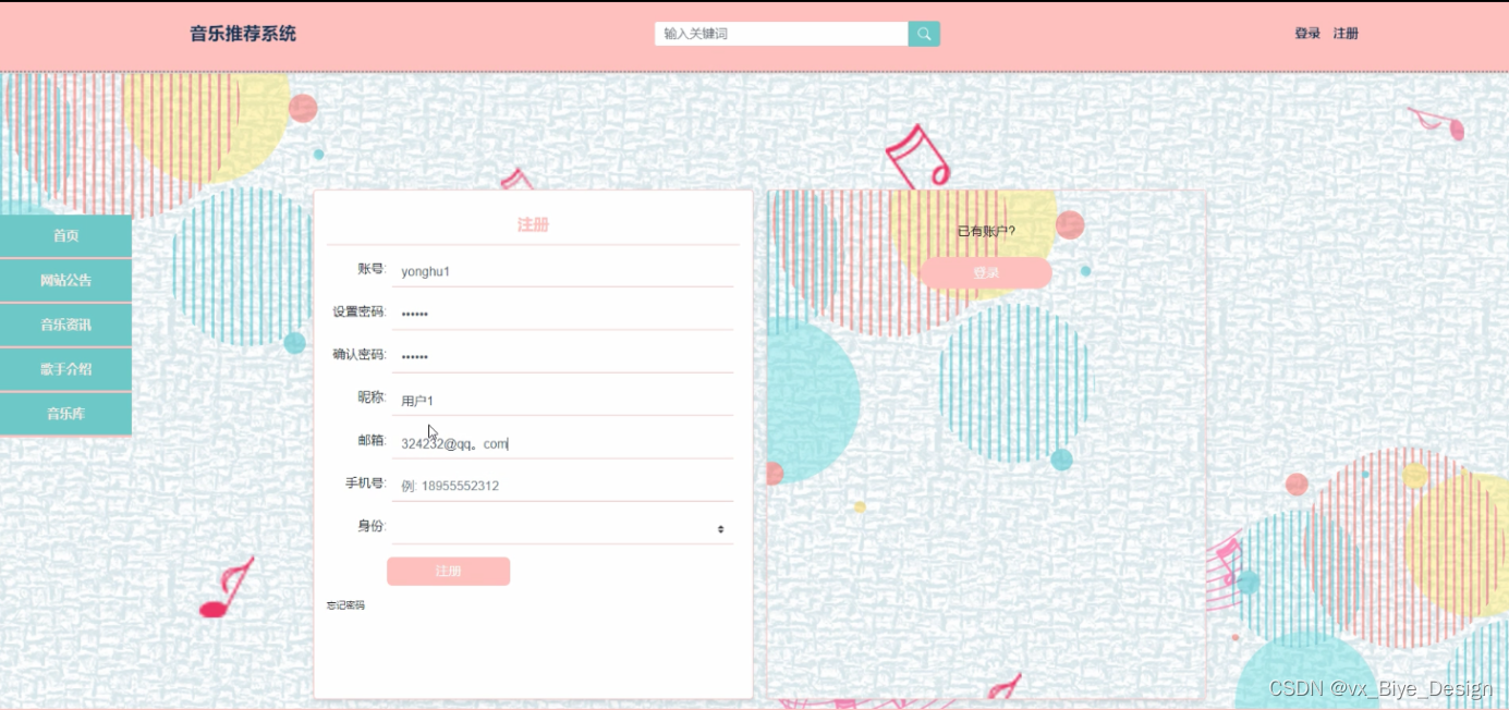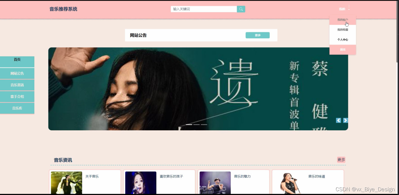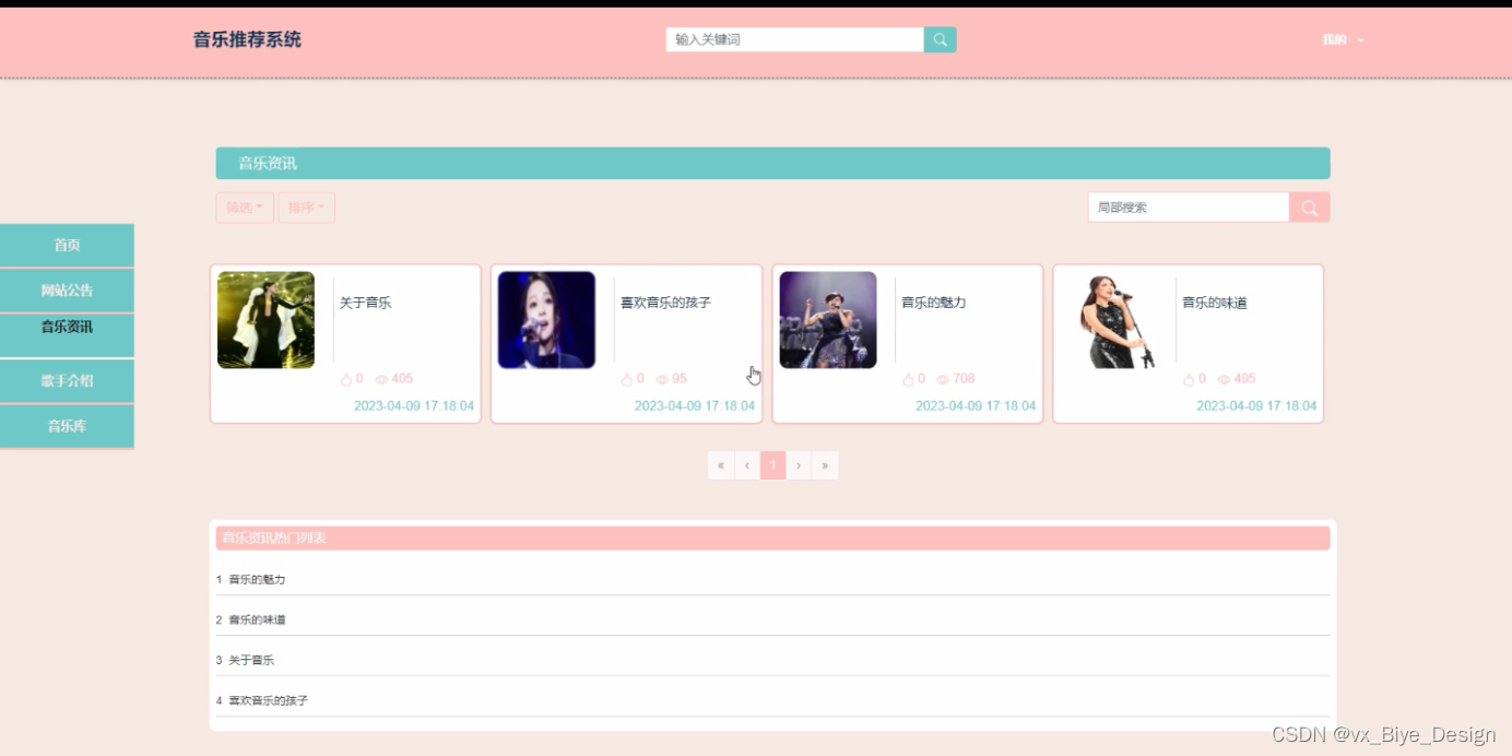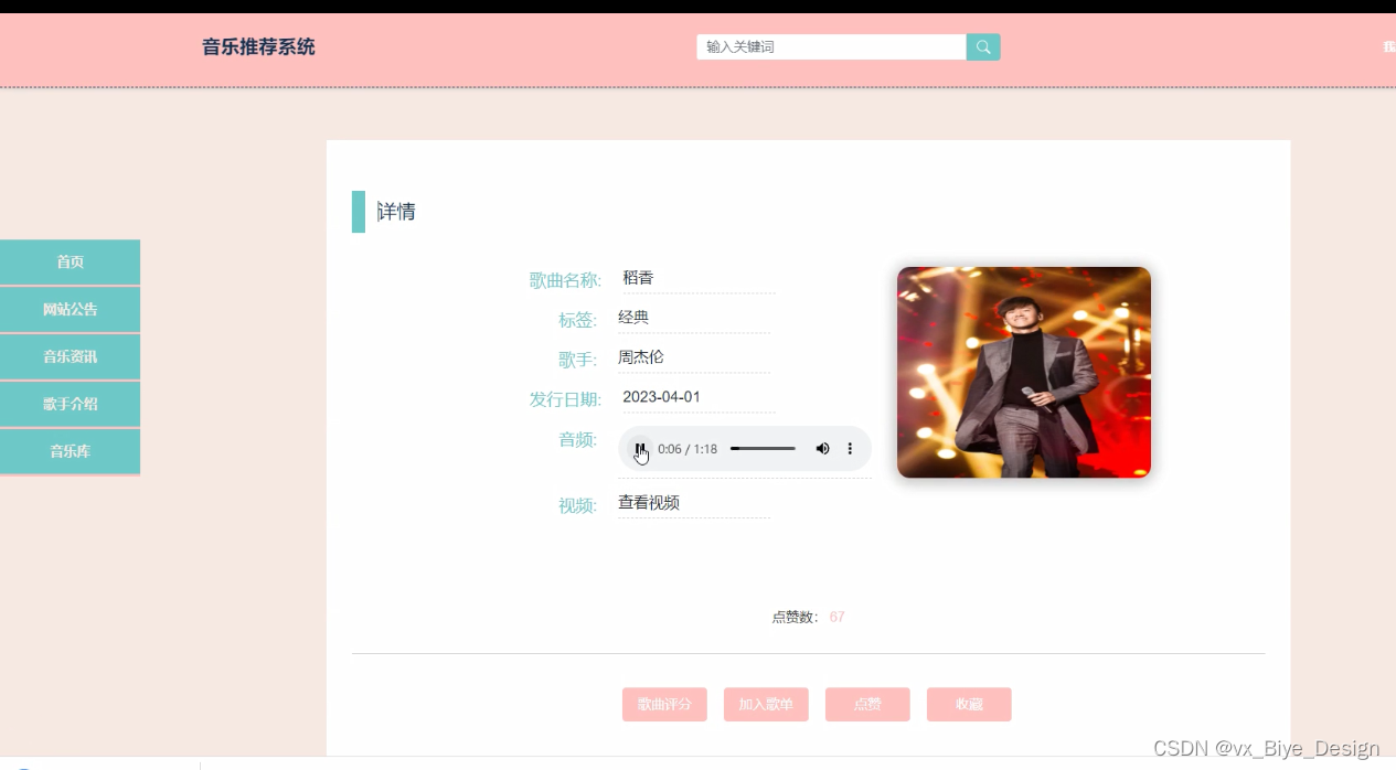 本课题的研究对象是音乐推荐系统,该系统实现了首页、轮播图、网站公告、资源管理(音乐资讯、资讯分类)系统用户(管理员、注册用户)模块管理(音乐标签、歌手介绍、音乐库、歌曲评分、用户歌单)等功能。本系统在设计上,考虑到系统内容以及系统的受众群体,在系统的美工方面采用了比较正规的设计,同时也提供了友好的页面以及简单的操作,系统采用Python语言、Django框架、MVC模式、MySQL数据库,这样的组合不但利用上了在大学中所学到的知识,并且能够使系统真正的发布到互联网上,而不是一个单纯的音乐系统。