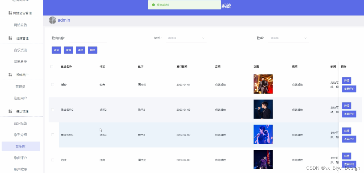 音乐库添加功能输入音乐名称、标签、歌手、发行日期、音频、封面、视频、可根据需要删除和修改。