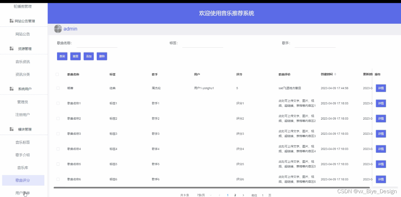 歌曲评分添加,功能主要指对其输入歌曲名称、标签、歌手、用户、评分、歌曲评价、提交添加歌曲评分,并根据需要删除和修改。