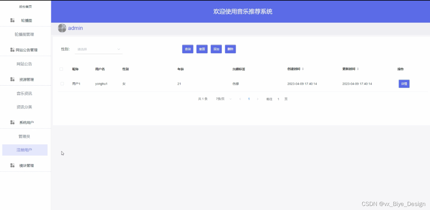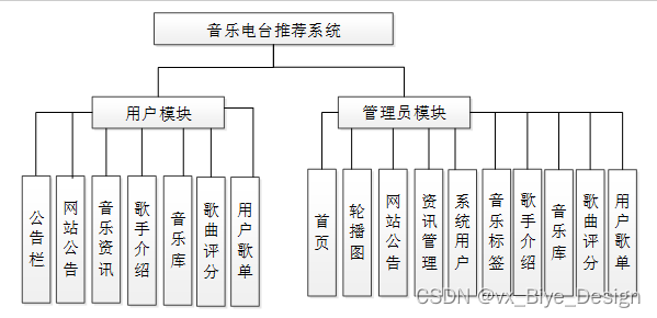 本系统主要包含了首页、轮播图、网站公告、资源管理(音乐资讯、资讯分类)系统用户(管理员、注册用户)模块管理(音乐标签、歌手介绍、音乐库、歌曲评分、用户歌单)。下面分别简单阐述一下这几个功能模块需求。