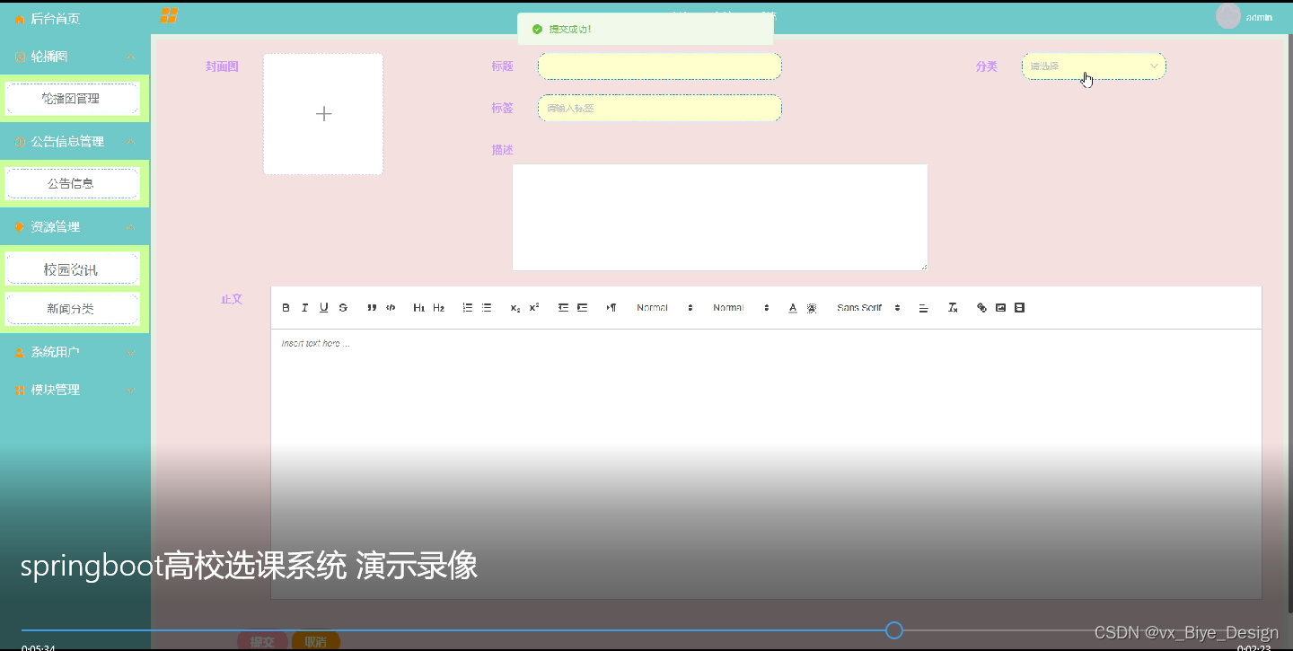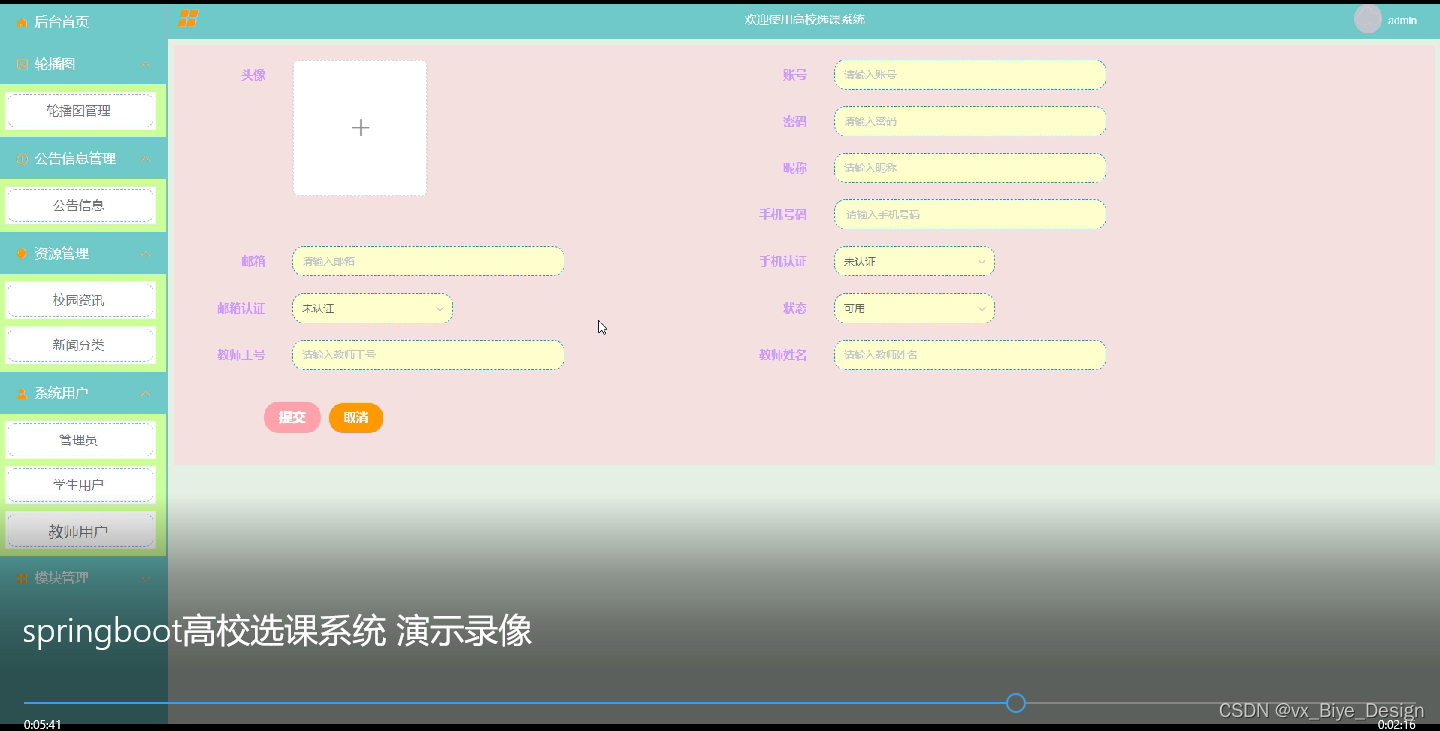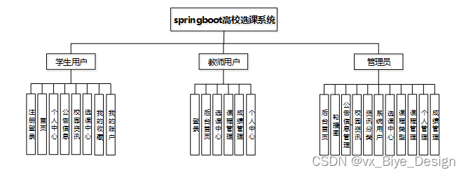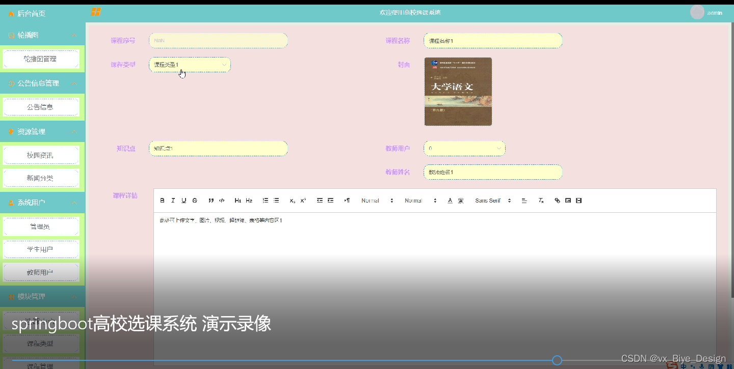 (1)功能要求:首页,轮播图管理,公告信息管理,人员管理(管理员,教师用户,学生用户),资源管理(校园资讯、新闻分类),模块管理(选课中心、课程类型、课程管理、成绩管理),个人管理等功能模块。
