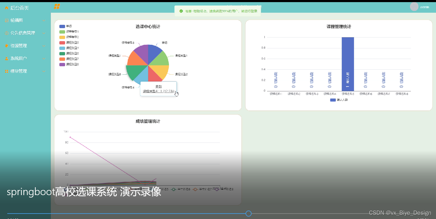 管理员进入系统后台可以查看:后台首页,轮播图管理,公告信息管理,人员管理(管理员,教师用户,学生用户),资源管理(校园资讯、新闻分类),模块管理(选课中心、课程类型、课程管理、成绩管理),个人管理等功能模块。