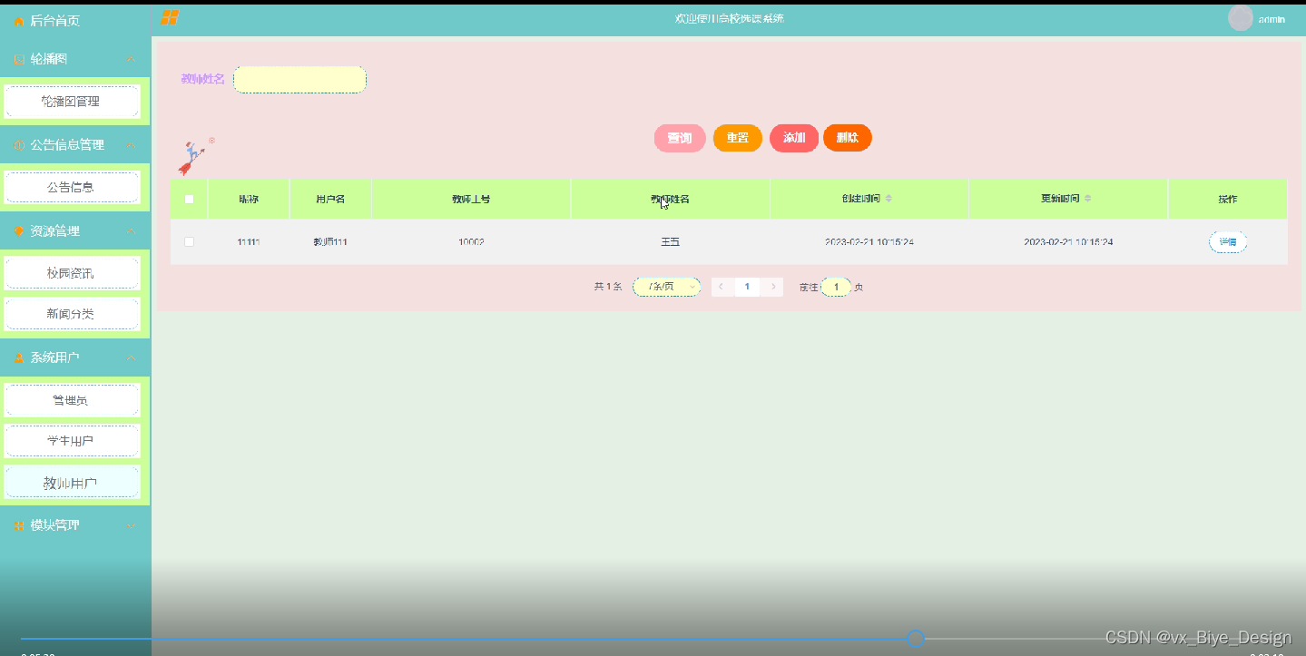 系统用户,在此页面可以查看用户信息,还可在该页面对用户进行重置、添加和删除等操作。以教师用户为例,如图5-3,5-4所示。