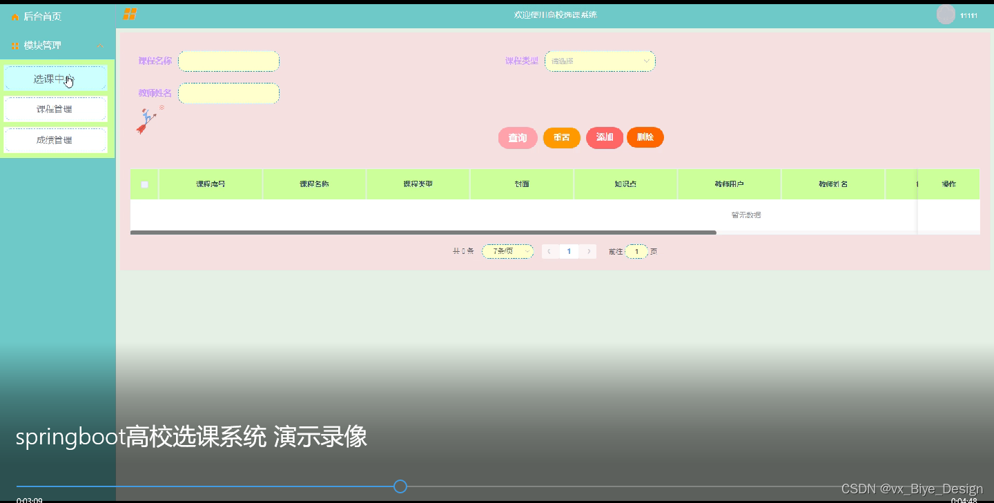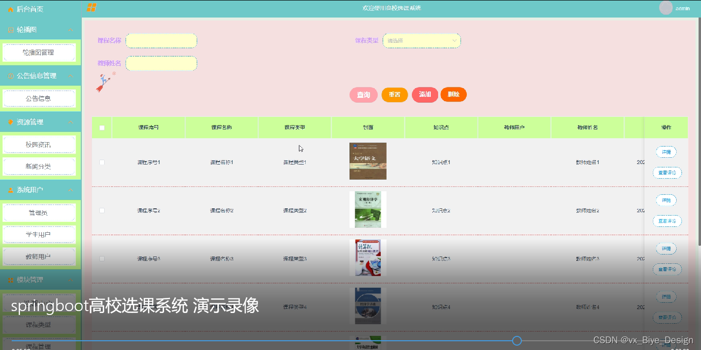 选课中心:可以通过搜索课程名称、课程类型、教师姓名进行查看课程序号、课程名称、课程类型、封面、知识点、教师用户、教师姓名等详细信息。并可以进行查询、重置、删除、添加等操作,如图5-11,5-12所示。