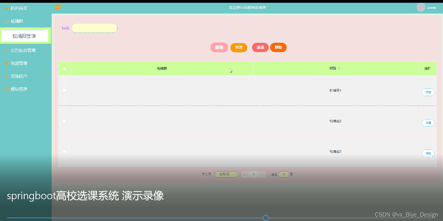 轮播图管理:可以查看轮播图信息的标题,封面图,内容等详细描述等信息。可以进行查询、重置、删除、添加等操作,如图5-5所示。