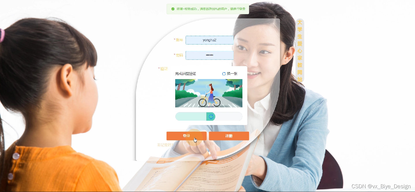 大学生爱心家教网站,在系统登录页面教师用户填写账号、密码等信息滑动滑块进行验证登录,如图5-14所示。
