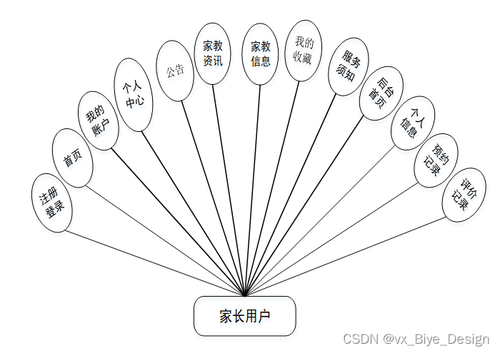 (2)家长用户:首页、公告、家教资讯、家教信息、服务须知、我的(我的账户、我的收藏、个人中心)后台首页:个人信息、模块管理(学生信息、预约记录、评价记录)等功能模块。家长用户用例图如图3-2所示。