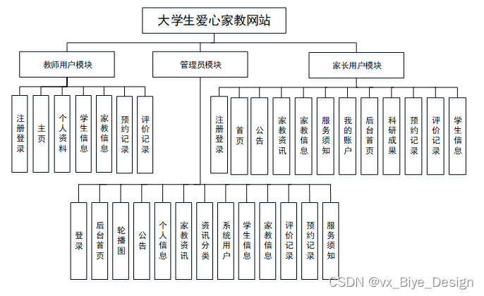 本大学生爱心家教网站主要包括两大功能模块,即管理员功能模块和用户模块。