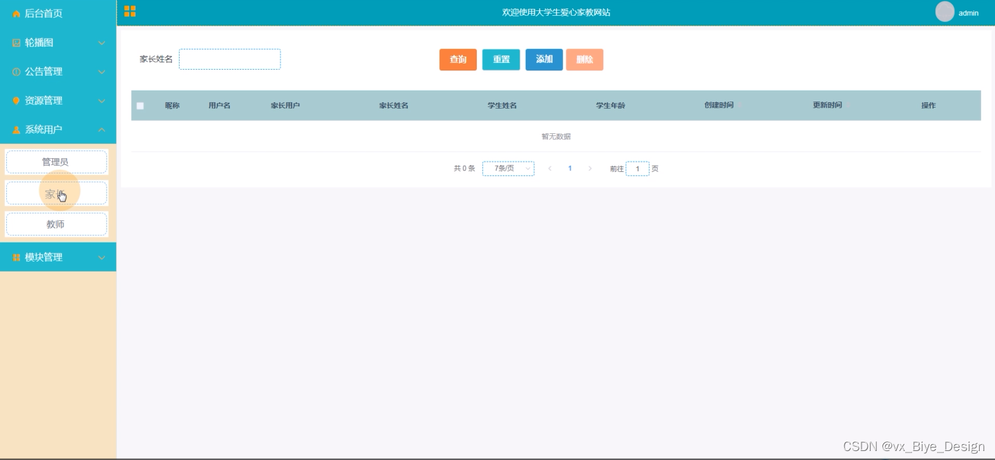 本文以java为开发技术,实现了一个SSM大学生爱心家教网站。大学生爱心家教网站的主要使用者分为管理员、教师、家长;主要实现的功能有:后台首页、轮播图管理、公告管理、资源管理、系统用户管理、学生信息管理、家教信息管理、预约记录管理、评价记录管理、服务须知管理等功能。通过这些功能模块的设计,基本上实现了整个大学生爱心家教网站管理的过程。