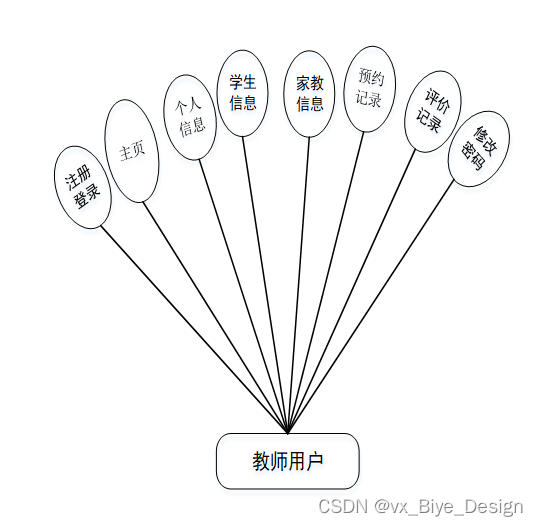 (3)教师用户:后台首页、个人信息、模块管理(学生信息、家教信息、预约记录、评价记录)等功能模块。教师用户用例图如图3-3所示。