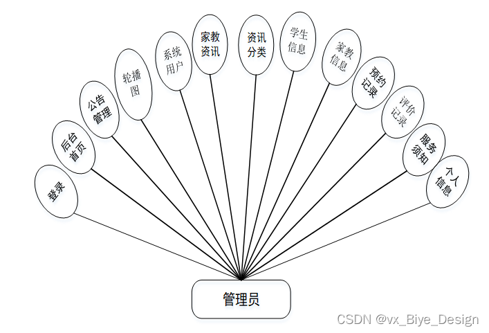 (1)管理员模块:系统中的核心用户是系统管理员,管理员登录后,通过管理员菜单来管理后台系统。主要功能有:后台首页、轮播图、公告管理、资源管理(家教资讯、资讯分类)系统用户(管理员、家长、教师)模块管理(学生信息、家教信息、预约记录、评价记录、服务须知)等功能模块。管理员用例图如图3-1所示。