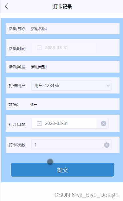 点击导航栏上的“打卡记录”,可以选择活动名称、活动时间、活动类型、打卡用户、姓名、打开日期、打卡次数,然后点击“提交”按钮进行提交打卡记录,打卡记录界面如下图4-8所示。