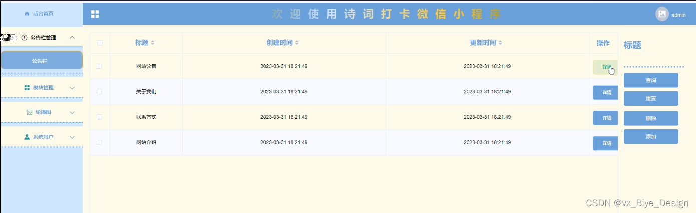 (1)公告栏管理:管理员可以对系统前台展示的公告栏进行增删改查,方便用户进行查看。