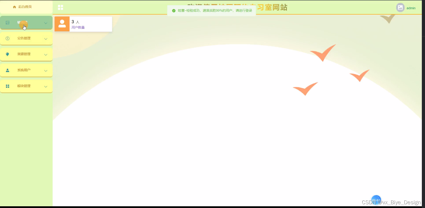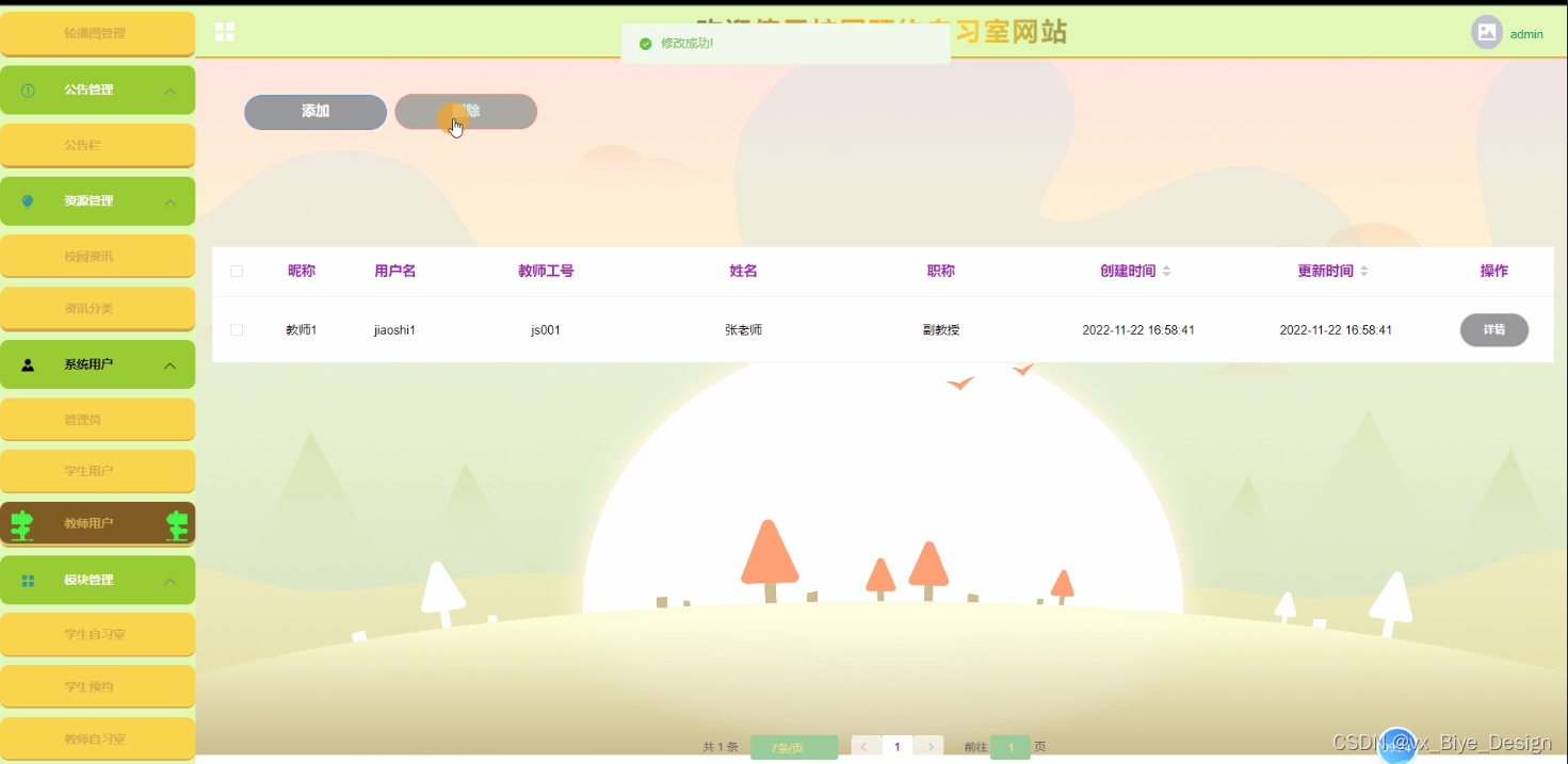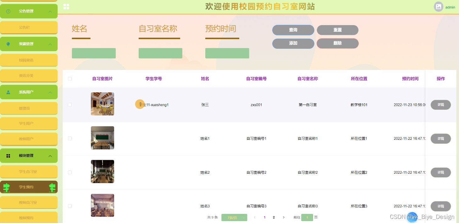 2. 系统功能还不够完善,无法提供丰富多彩的在线功能,只能实现管理员:首页、轮播图、公告栏、资询管理(校园资讯、资讯分类)系统管理(管理员、学生用户、教师用户)模块管理(学生自习室、学生预约、教师自习室、教师预约)系统管理等一系列功能。