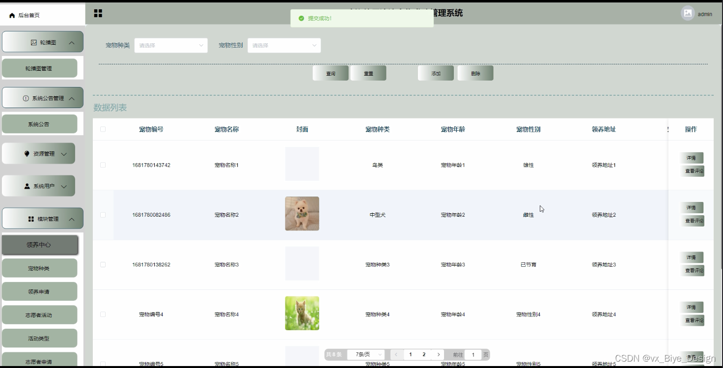 领养中心管理,在领养中心管理页面中可以查看宠物编号、宠物名称、封面、宠物种类、宠物年龄、宠物性别、领养地址等信息,并可根据需要在领养中心页面对已有的领养中心进行编辑删除或详细等操作,如图5-8所示。