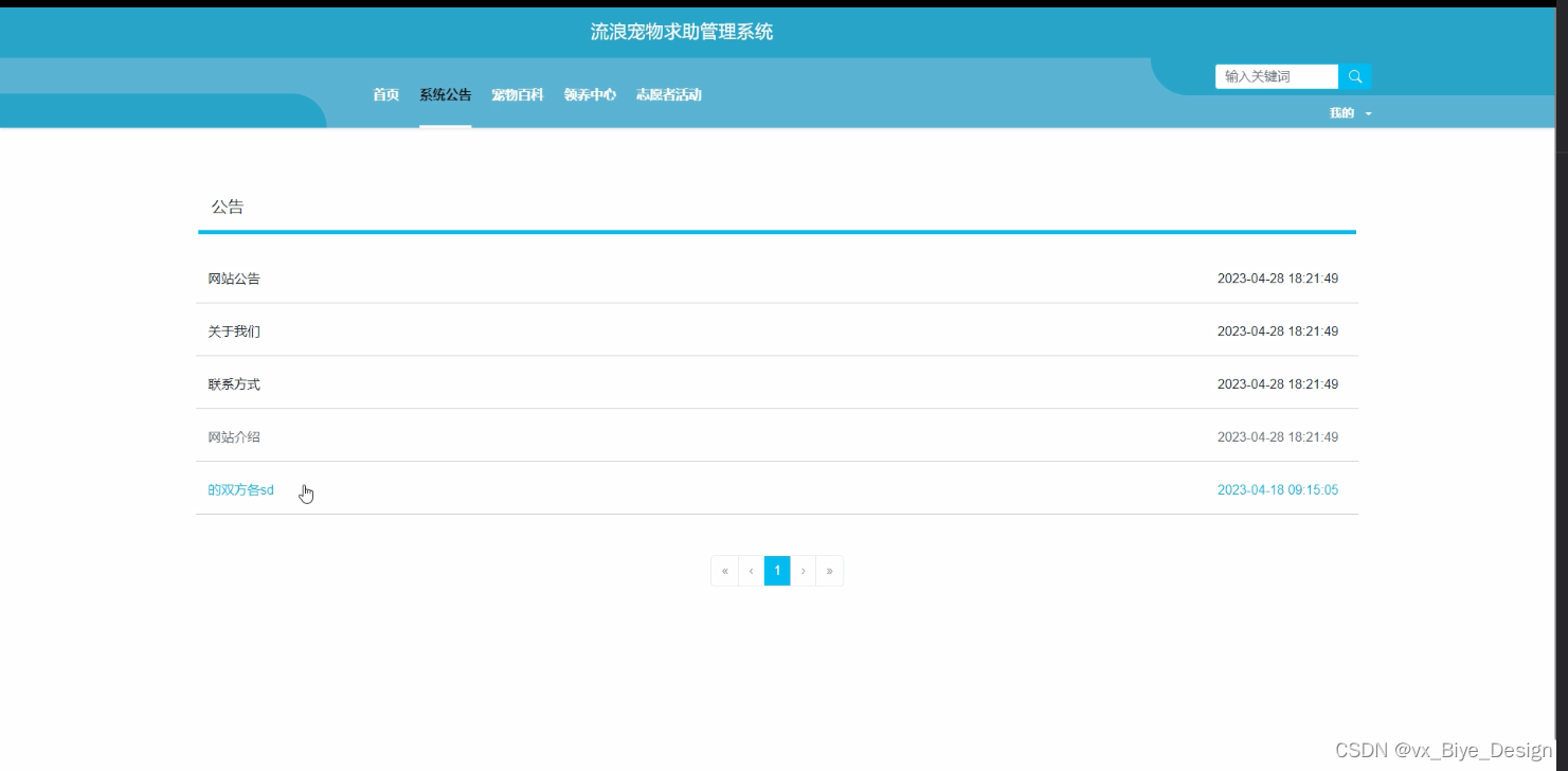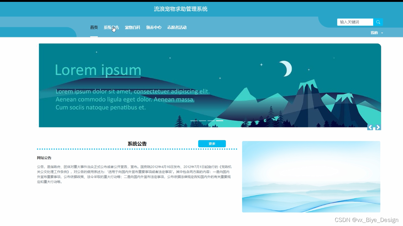 流浪宠物求助管理系统,在系统首页可以查看网站首页、系统公告、宠物百科、领养中心、志愿者活动等内容,如图5-1所示。