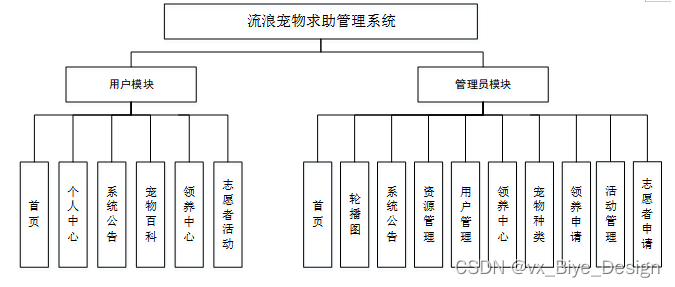 系统架构图属于系统设计阶段,系统架构图只是这个阶段一个产物,系统的总体架构决定了整个系统的模式,是系统的基础。流浪宠物求助管理系统的整体结构设计如图4-2所示。
