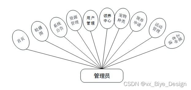系统中的核心用户是系统管理员,管理员登录后,通过管理员来管理后台系统。主要功能有:首页、轮播图、系统公告、资源管理(宠物百科、分类列表)系统用户(管理员、普通用户)模块管理(领养中心、宠物种类、领养申请、志愿者活动、活动类型、志愿者申请)等功能。管理员用例如图3-7所示。