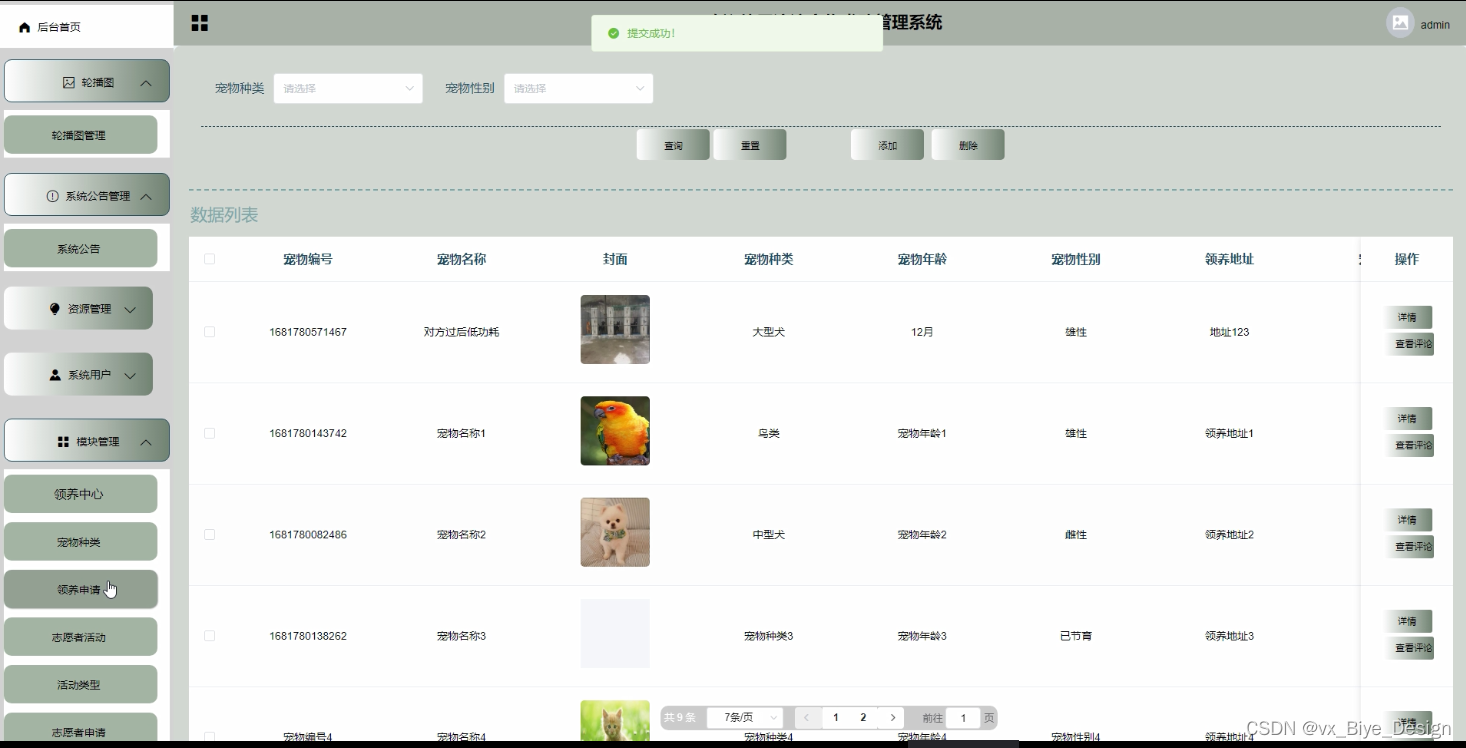领养申请管理,在宠物领养管理页面中可以查看宠物名称、图片、宠物分类、宠物性别宠物年龄、宠物性别、领养用户、领养地址等信息操作,并可根据需要对宠物领养进行审核申请,编辑删除详细等操作操作,如图5-9所示。