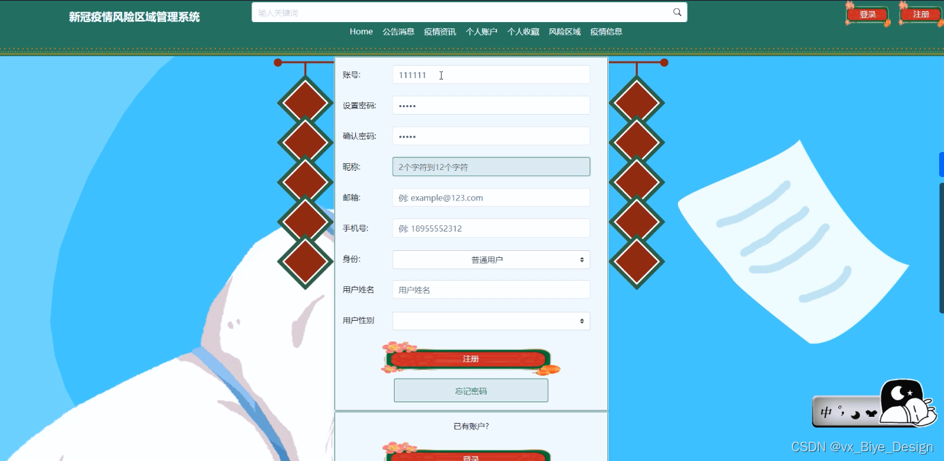 (1)用户注册登录:游客可以随时进入到系统中,对系统中的信息浏览,但是想要实现风险区域以及疫情信息等操作,就必须有这个系统的账号,如果没有账号的话,可以注册以后进行相关的操作,同时用户还可以通过“个人账户”这以按钮对个人信息以及操作的信息进行管控。