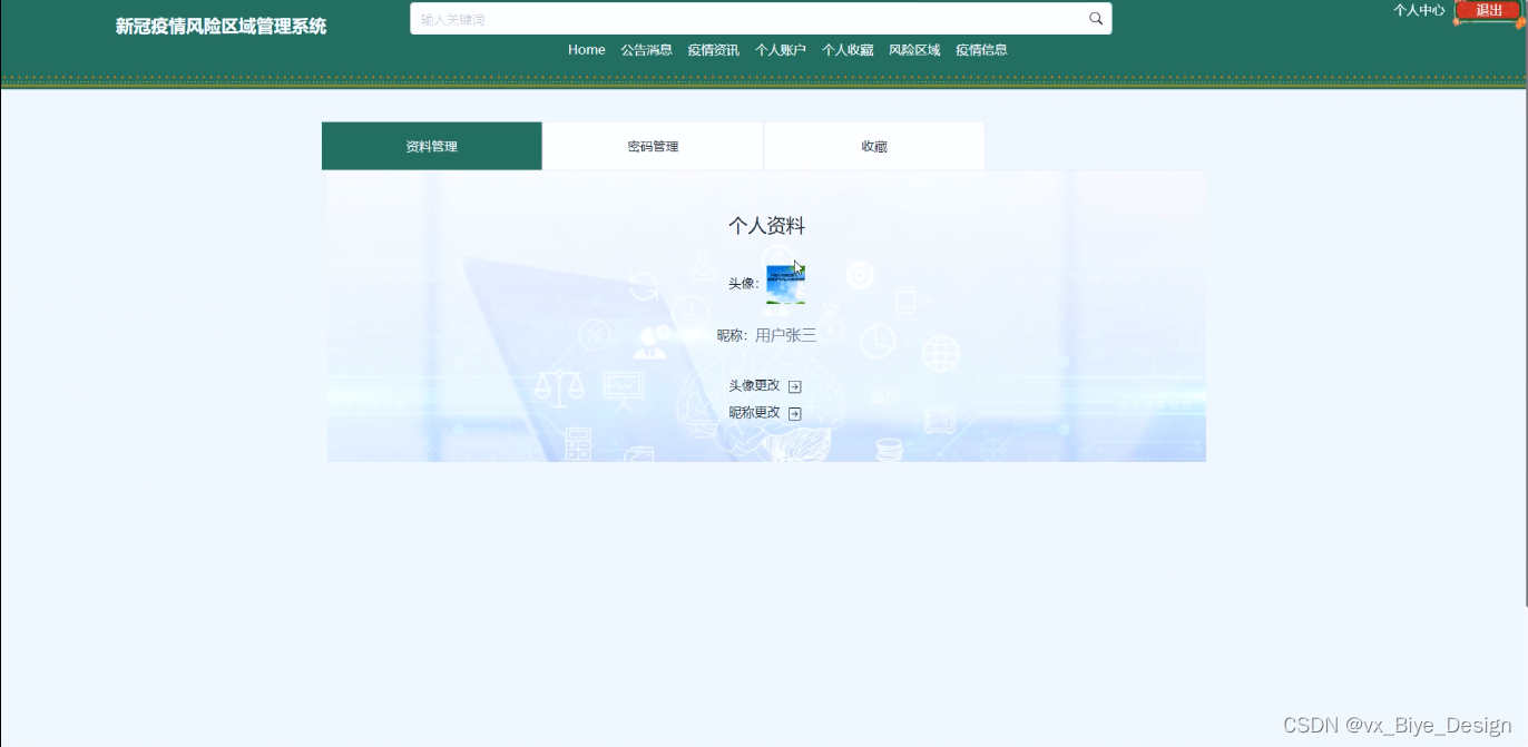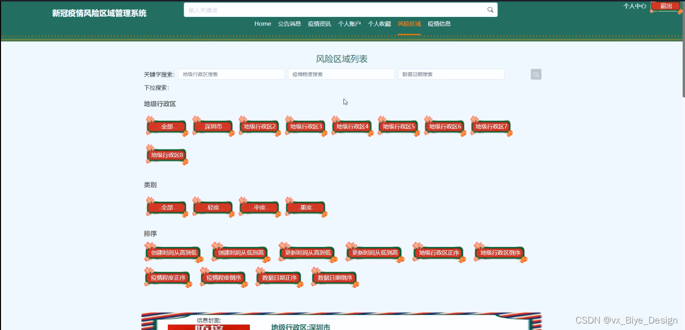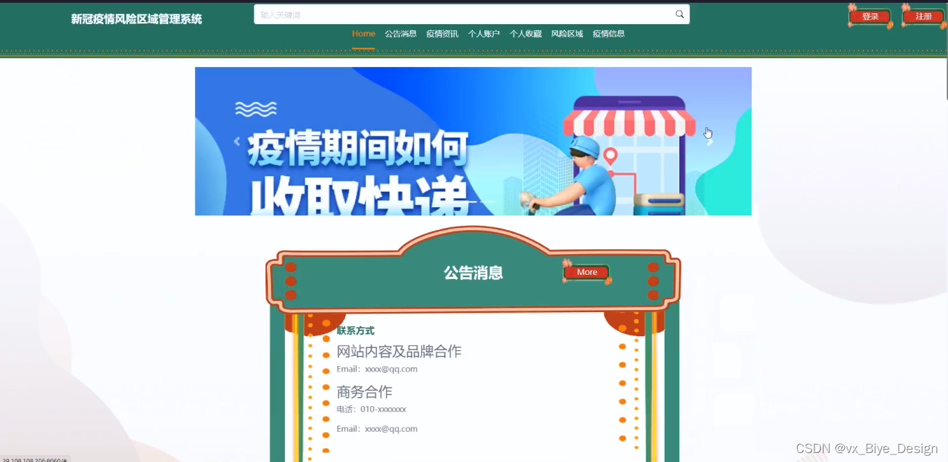 (2)查看新冠疫情风险区域管理系统的首页信息:新冠疫情风险区域管理系统 的首页信息包含了首页、公告消息、疫情资讯、个人账户、个人收藏、风险区域、疫情信息、个人中心。
