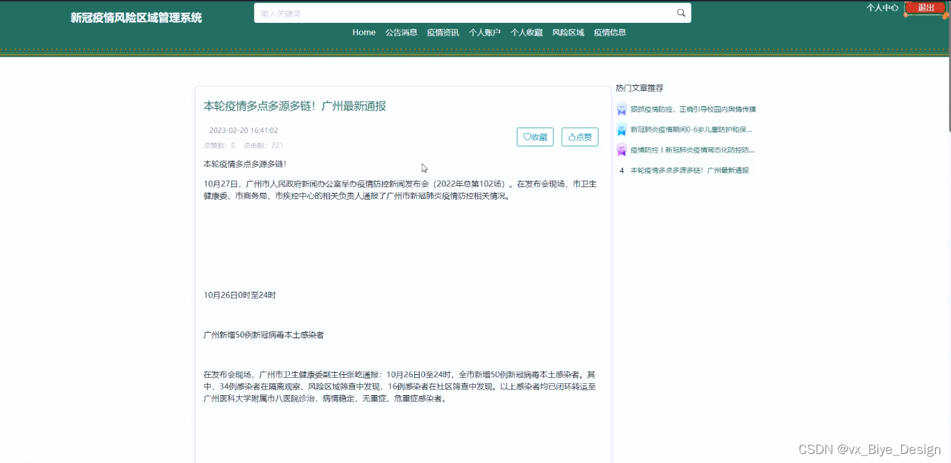 当访客点击新冠疫情风险区域管理系统中导航栏上的“疫情资讯”后将会进入到该“疫情资讯”列表的界面,然后选择想要看的疫情资讯信息,点击进入到详细界面,在详细界面可以收藏+点赞+评论等操作,疫情资讯界面如下图4-6所示。