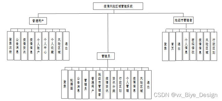 新冠疫情风险区域管理系统划分为了普通用户模块、地级市管理者和管理员模块这三大部分。