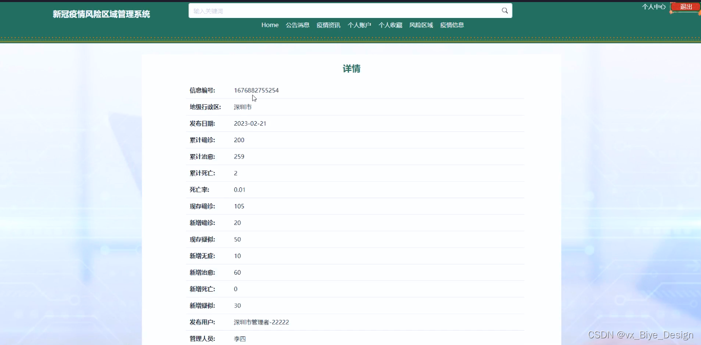 当访客点击了任意疫情信息后将会进入该款疫情信息的详情界面,可以了解到该疫情信息的信息编号、地级行政区、发布日期、累计确诊、累计治愈、累计死亡、死亡率、现存确诊、新增确诊、现存疑似、管理人员等,疫情信息详情展示页面如图4-7所示。