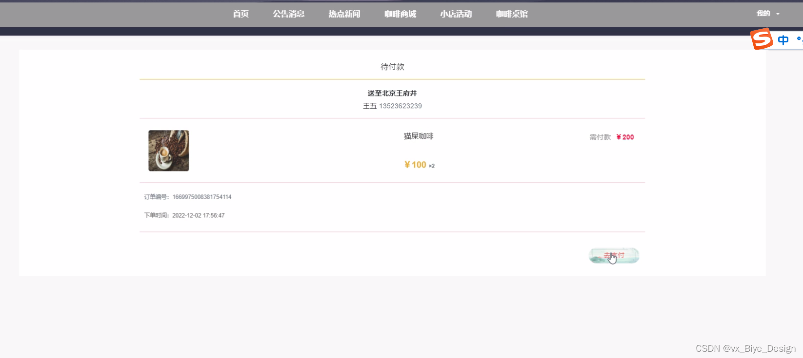 客户可以首次查看详细的介绍,咖啡销售系统中各种商品的实物图,价格和其他基本信息,以便客户可以识别自己满意的商品。选择商品后,客户可以将选择的商品添加到购物车中,如果您在清算前改变主意,仍然可以不用购买。客户选择要购买的商品后,可以将其提交给系统软件,系统软件将自动生成一个相对的订单号。