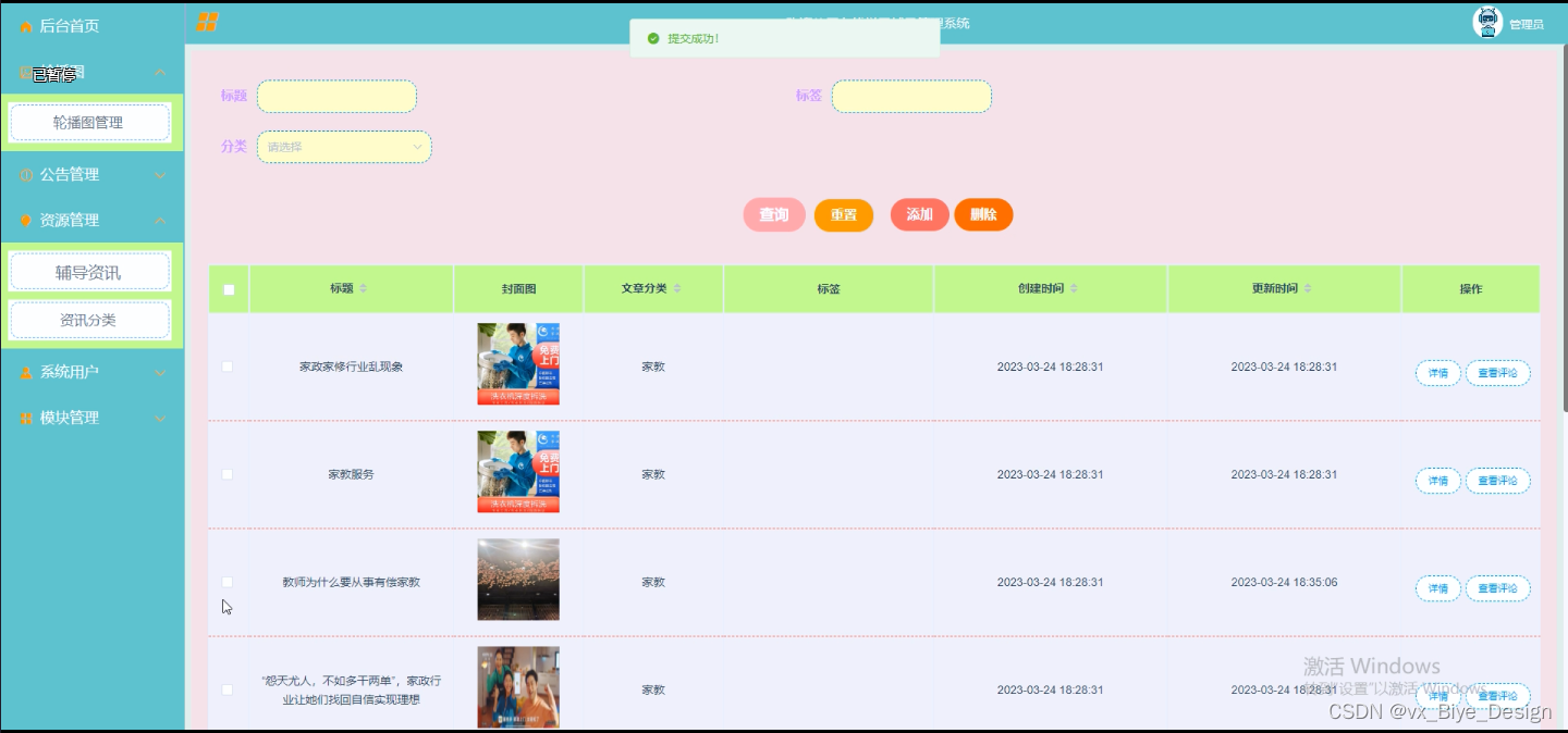 (2)公告/轮播图管理:管理员可以对系统前台展示的轮播图以及公告进行增删改查,方便用户进行查看。