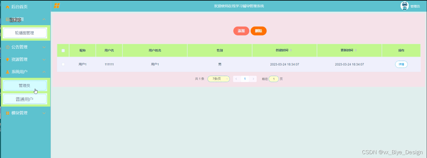 在线学习辅导管理系统从角色上划分为了普通用户以及管理员两种角色。