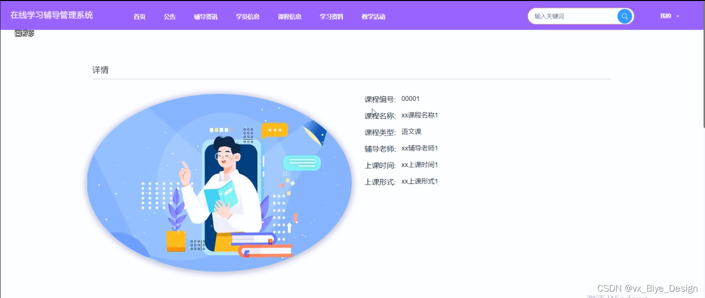 (6)课程信息:用户可以查看课程信息信息支持通过搜索关键词的方式对课程信息进行查询,在查询到自己想要了解的课程信息的时候,可以进入查看详细的介绍。