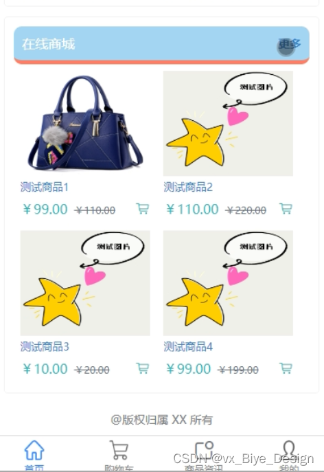 在线商城,在线商城页面可以商品名称、商品价格、商品图片、商品描述等信息,并可根据需要加入购物车、收藏或购买。如图5-5所示。