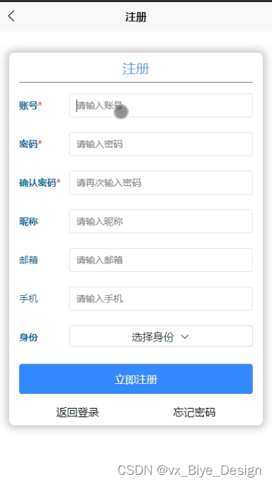 注册,通过填写账号、密码、昵称、邮箱、手机、身份等信息,输入完成后选择提交即可注册成功,如图5-2所示。