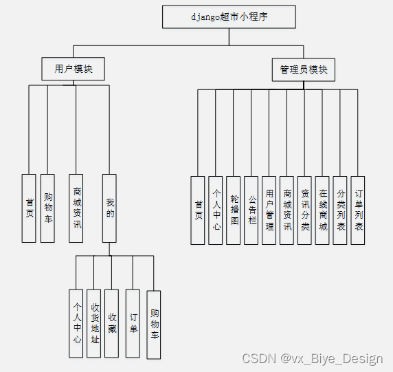 基于超市小程序的设计基于现有的手机,可以实现首页、轮播图、公告信息、资源管理(商品资讯、资讯分类)商城管理(在线商城、分类列表、订单列表)系统用户(管理员、普通用户)等详细的了解及统计分析。根据系统功能需求建立的模块关系图如下图: