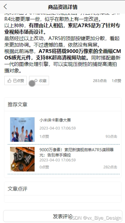 商城资讯,在商城资讯页面可以查看标题、资讯内容、封面等信息,并可对资讯进行点赞、收藏等操作。如图5-4所示。