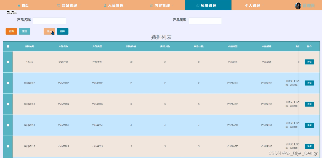 | 用例描述 | 管理员正确登录后台管理的条件下,对产品团购模块进行管理 |