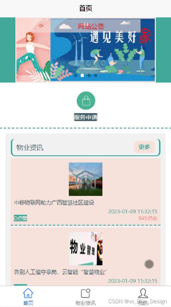 首页,物业资讯,基本信息,收藏,服务申请,服务进度,服务评论等。