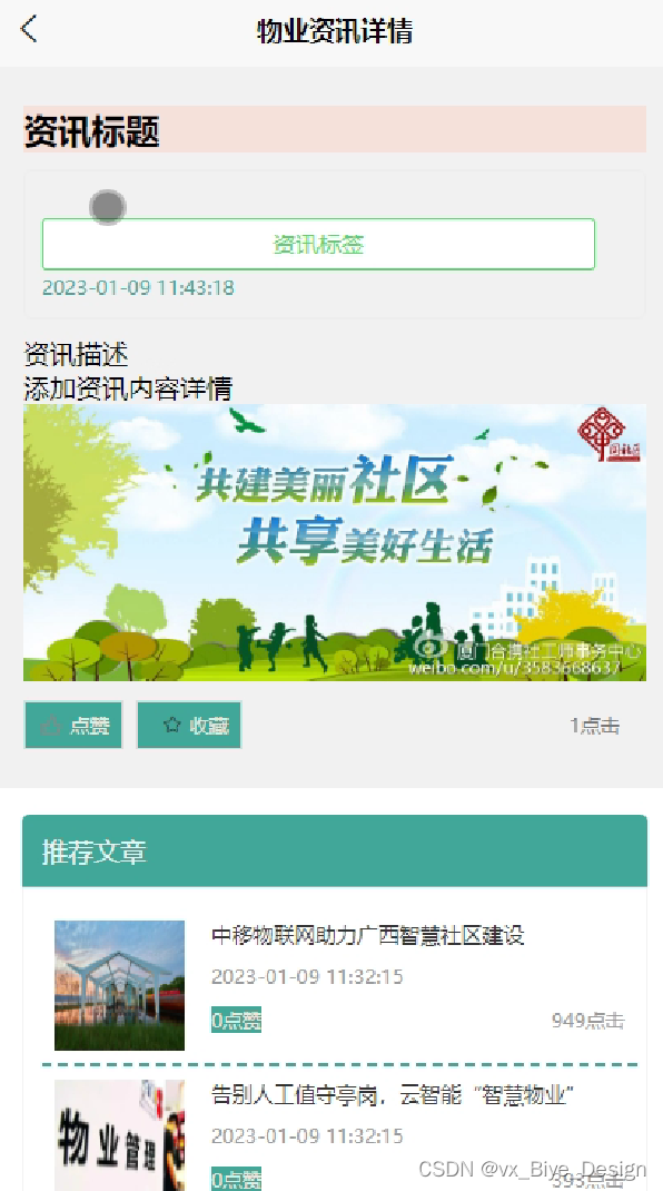 业主用户对物业资讯进行查看,搜索,点赞,收藏,评论等等操作,如下图所示。