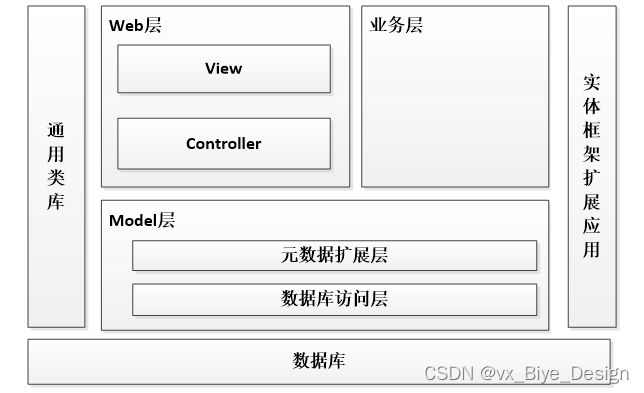 本物业管理系统的架构设计主要分为可以3层,主要有Web层,业务层,Model层。其中web层还包括View层和Controller层,Model层包括元数据扩展层和数据访问层。