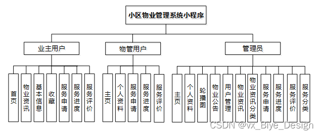 物业管理系统总体分为业主用户模块,物管用户模块和管理员模块。