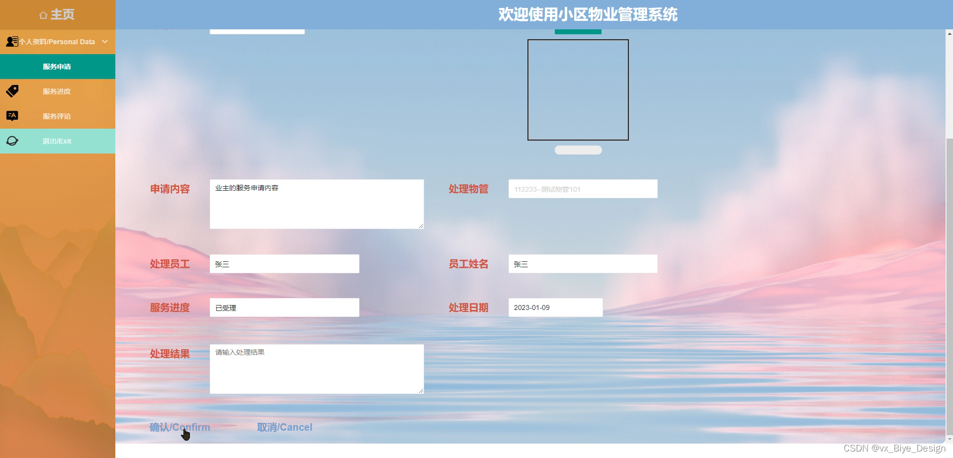 主页,个人资料(个人信息,密码修改),服务申请,服务进度,服务评论等。