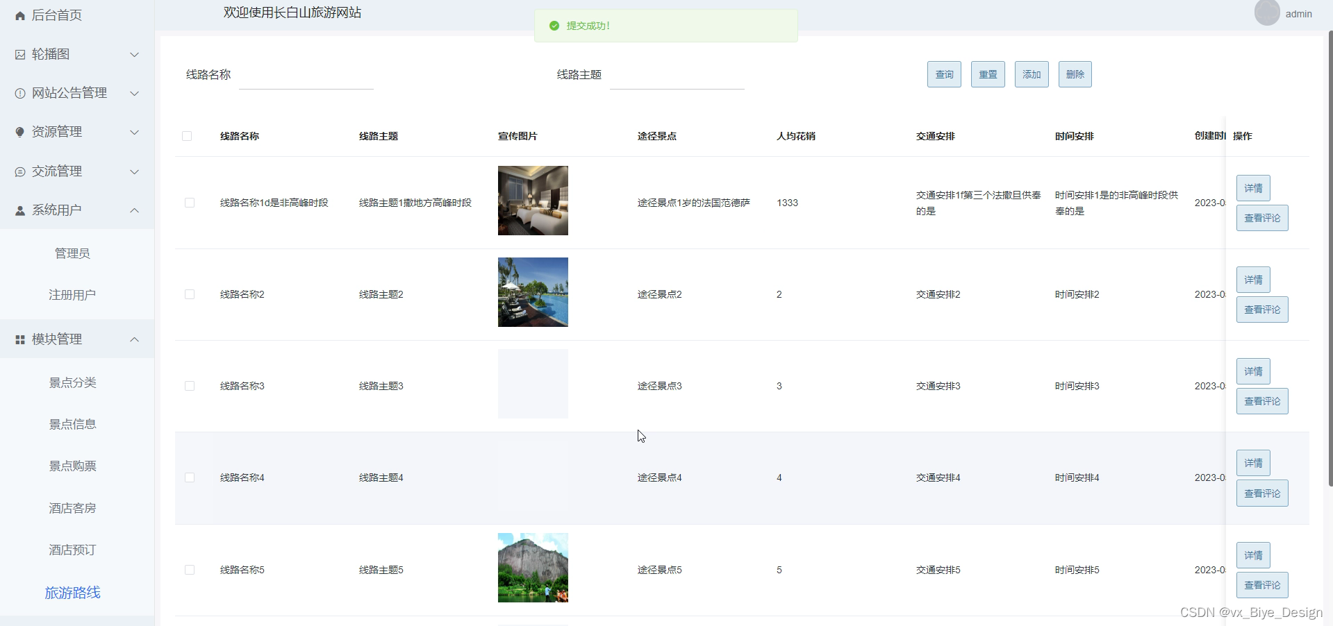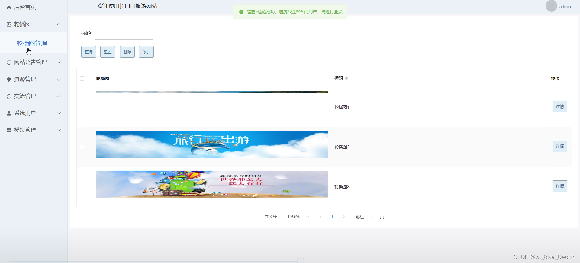 - 轮播图与通知公告管理:管理员可以对系统前台展示的轮播图以及公告进行增删改查,方便用户进行查看。