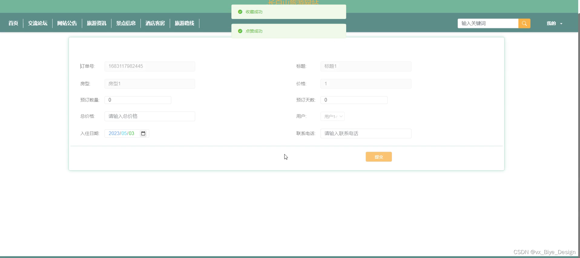 (4)酒店客房:用户可以查看酒店客房,用户可以在关键字搜索输入酒店名称,浏览相关酒店的详细信息。点击进入酒店详细介绍,可对酒店进行点赞、收藏及预定。点击“预定”这一按钮以后会跳转到预定信息填写的界面,根据提示填写好信息,点击“提交”以后就完成酒店预定。
