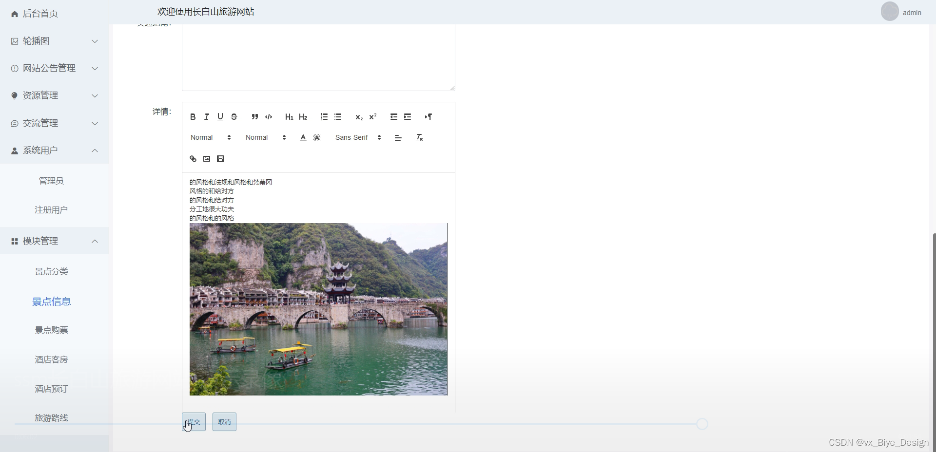 | 测试流程 | 1)管理员点击旅游景点,然后点击添加后并填写信息。 2)点击进行提交。 |