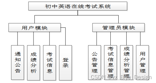 初中英语在线考试系统的功能主要分为前端学生根据自己的需求进行注册登录,在线考试、成绩查询操作。后端可以供教师以及管理员进行登录,教师进行题目的发布添加,对考试成绩进行分析,系统管理员可以发布通知公告,对考试信息以及成绩信息进行维护管理。